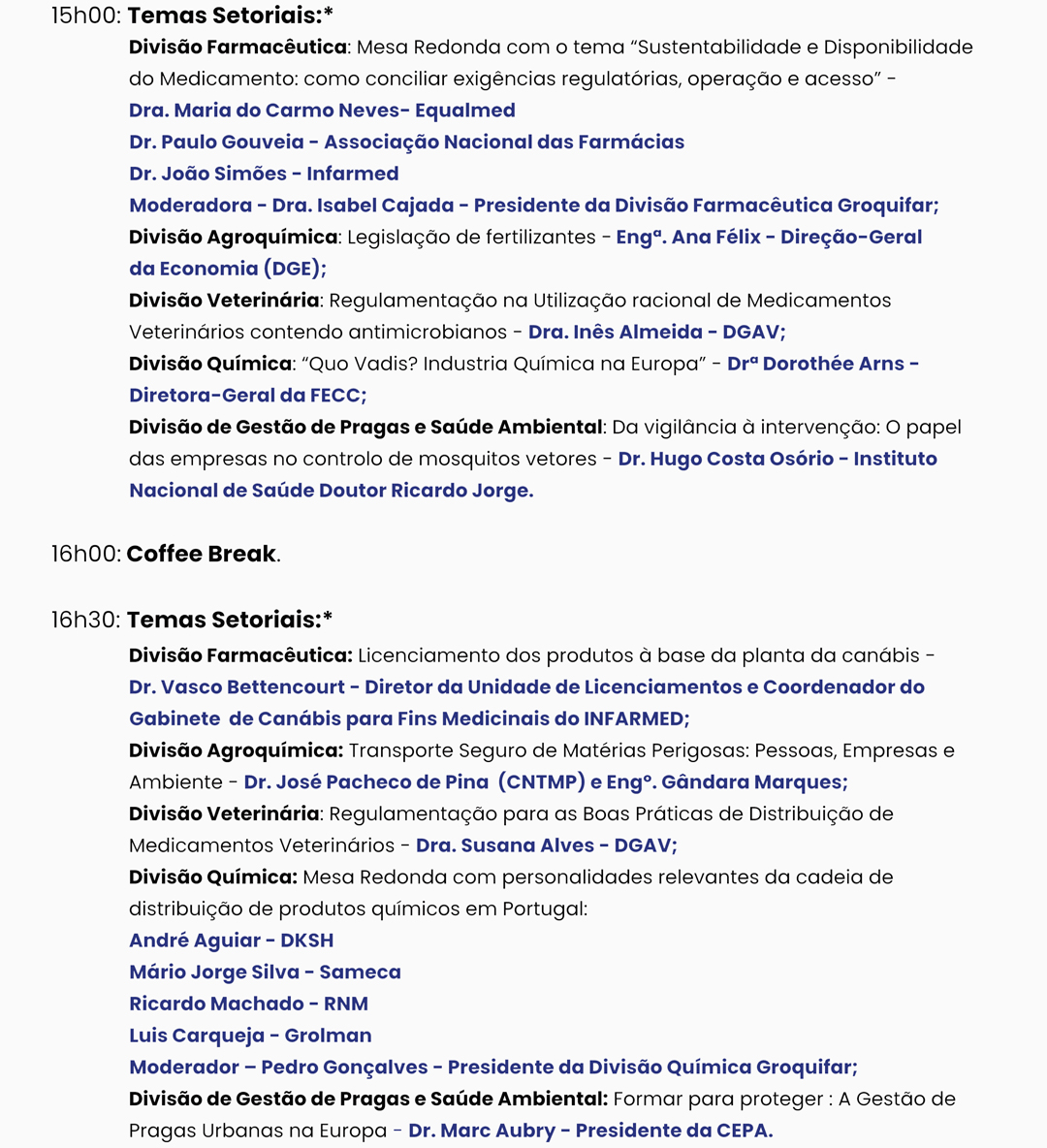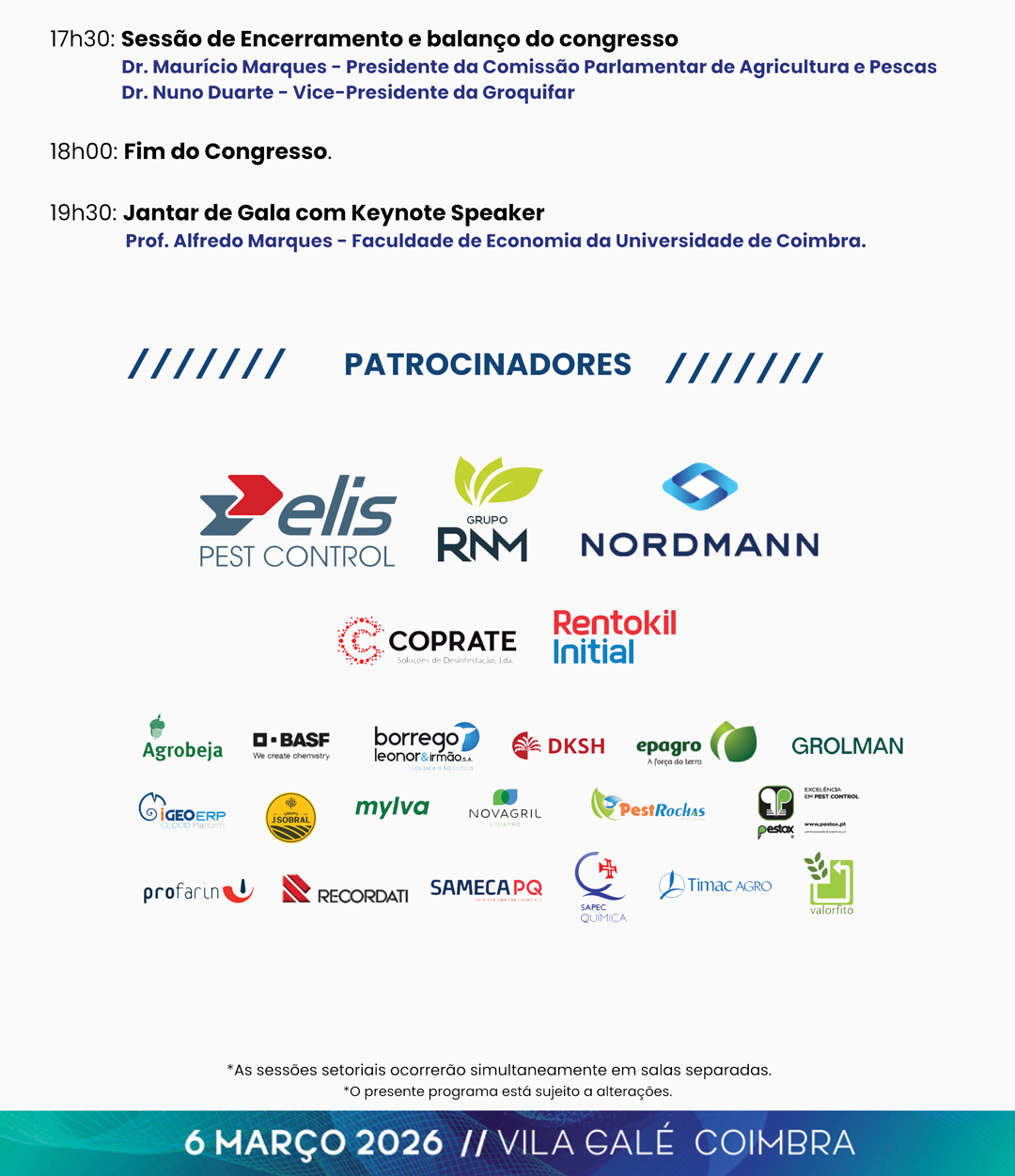 No local do evento encontrará um ambiente amplo, funcional e acolhedor, com sessões técnicas de carácter geral e outras especificamente dedicadas a cada setor que integra a Groquifar. Este 3.º Congresso dá continuidade a um fórum de debate ativo e participado, centrado nos temas que hoje estão no centro da agenda do setor, convidando todos a fazerem parte desta reflexão coletiva e deste momento marcante da vida associativa. |