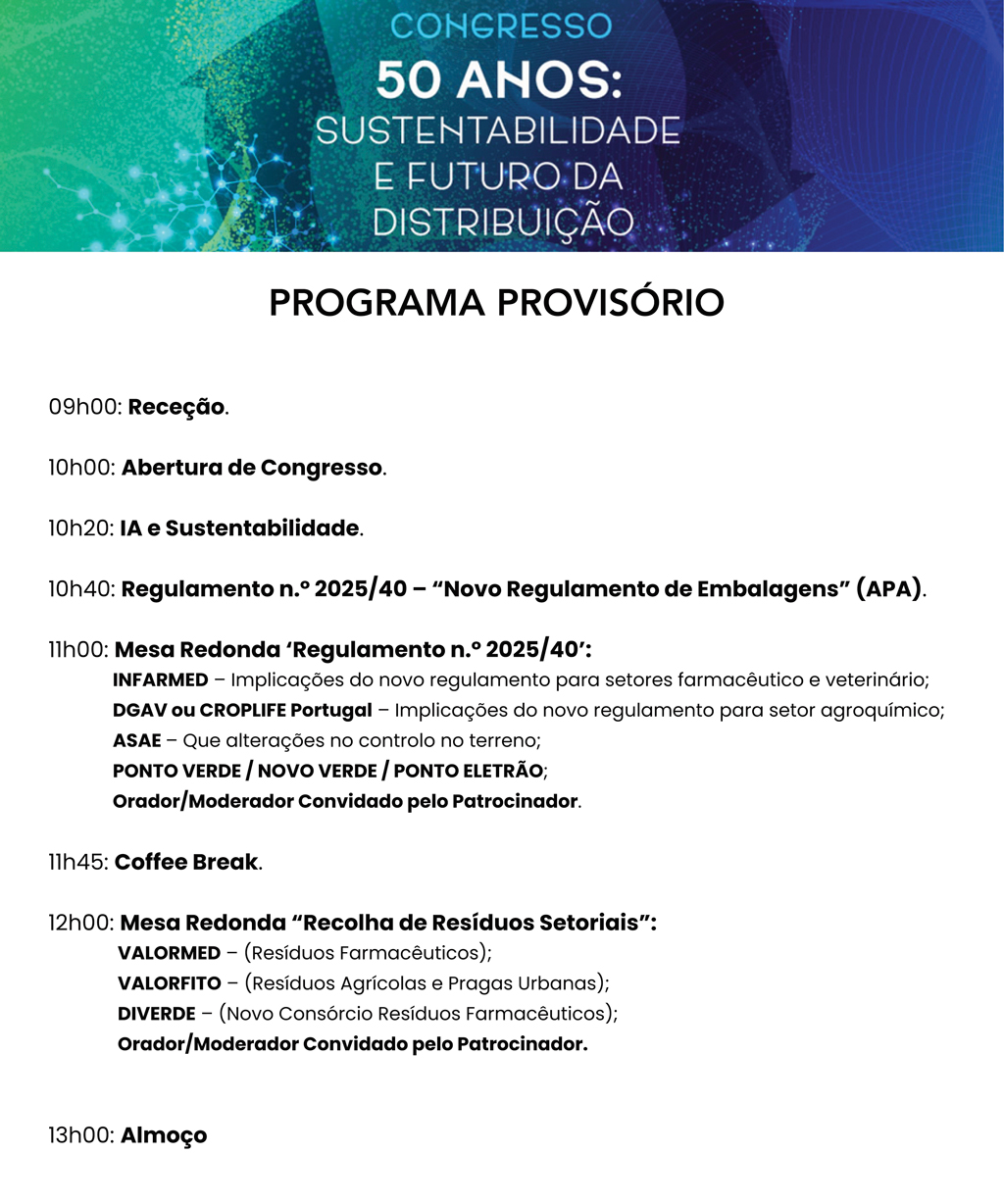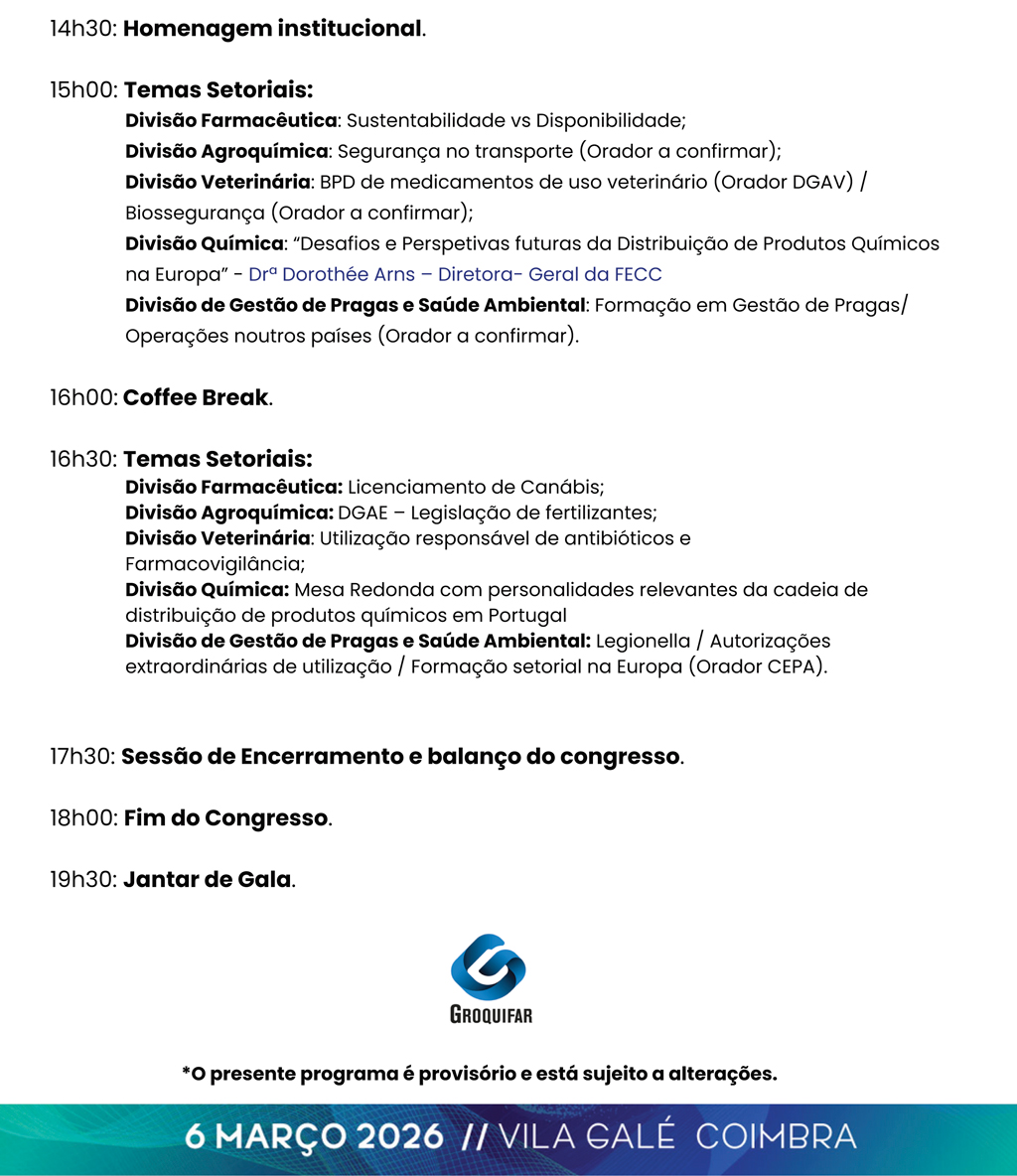 A Direção da GROQUIFAR tem o prazer de anunciar a realização do 3.º Congresso da Associação, integrado nas comemorações do seu 50.º aniversário, subordinado ao tema “50 anos: Sustentabilidade e Futuro da Distribuição” e que terá lugar em Coimbra, no dia 6 de março de 2026.